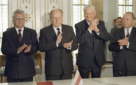 30 лет назад в 1991 году в правительственной резиденции Вискули (Беловежская Пуща, Белоруссия) главы РСФСР, Украины и Белоруссии Борис Ельцин, Леонид Кравчук и Станислав Шушкевич подписали Соглашение о создании Содружества Независимых Государств и о роспуске СССР, вошедшее в историю как «Беловежское соглашение», напоминает