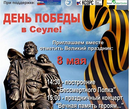 Координационный совет организаций российских соотечественников (КСОРС) в Республике Корея приглашает соотечественников на празднование Дня Победы в Сеуле 8 мая 2016 года.
