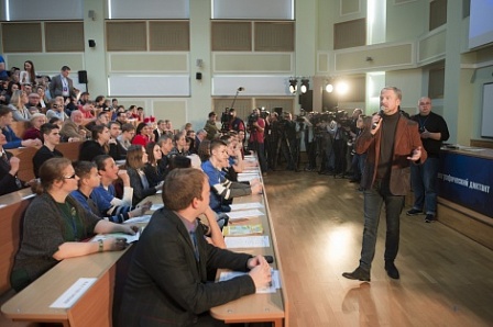 Президент РГО Сергей Шойгу и ещё около тысячи человек писали диктант на его центральной площадке – в Шуваловском корпусе МГУ имени М.В. Ломоносова в Москве.