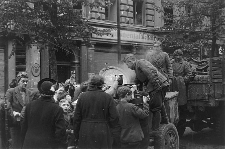 На фото: Красноармейцы раздают пищу жителям Берлина / www.70-jahre-kriegsende.de.