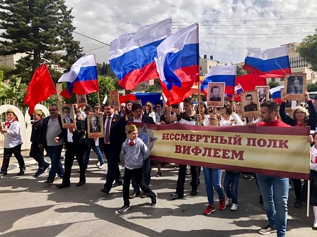 В Вифлееме прошло торжественное шествие «Бессмертного полка». На мероприятие собралось более 300 человек из разных городов Палестины. В одном строю с фотографиями родственников - участников Великой Отечественной войны, с флагами и песнями военных лет, прошли взрослые, дети и молодежь.