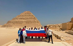 Египетская молодежь растянула российский триколор у пирамид в преддверии Дня Государственного флага Российской Федерации