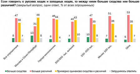Итак, между русскими и западными людьми больше различий — считают россияне (47%). Что сходств и различий примерно поровну, думают 38% россиян. Это мнение в полтора раза чаще выражают 18-24-летние россияне (53%), а также жители столиц и городов-миллионников.