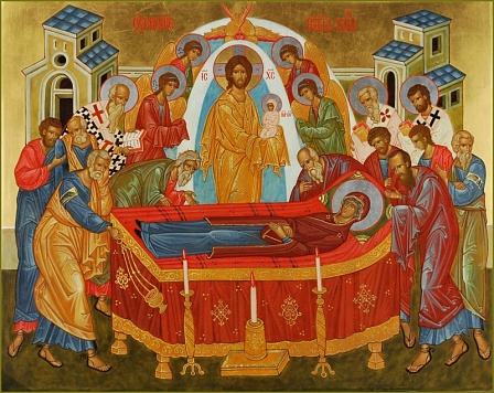 Время, когда произошло Успение Пресвятой Богородицы, неизвестно. Очевидно, что это было до первых гонений на христиан, развязанных безумцем Нероном в 64 году. Из Книги Деяний видно, что после Вознесении Господа на Небо, Богородица жила в Гефсимании, в доме апостола евангелиста Иоанна. Там она и скончалась. Когда на третий день после Ее успения, апостолы открыли гроб, то увидели в нем только погребальные пелены. На иконе праздника Успения над почившей во гробе Богородицей - почившей, но не умершей, изображен Христос. Как некогда Богоматерь держала на руках младенца Христа, так теперь Ее Сын, спустившийся с небес к Ее смертному одру, принимает на Свои руки маленькую, хрупкую и чистую душу Марии, родившуюся в новую жизнь. И это еще раз подчеркивает, что праздником Успения мы отмечем не смерть, а рождение в жизнь вечную.
