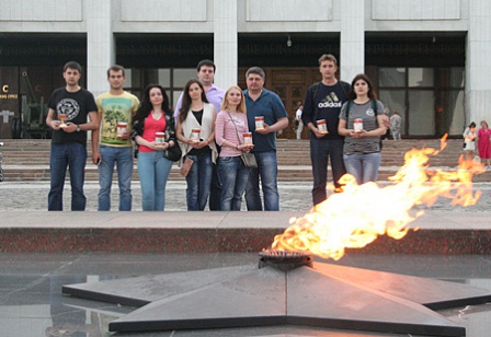 Участники проходящего в Москве заседания молодежной экспертной группы учебно-тренинговой программы «Правовые и исторические знания как основа правозащитной деятельности соотечественников» 21 июня 2016 года приняли участие в акции «Свеча памяти» на Поклонной горе.
