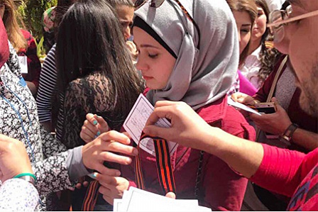 У медицинского факультета студенты кафедры русского языка менее чем за полчаса раздали более 1,5 тысячи ленточек вместе с памятками на арабском языке, где вкратце объясняется важность символа в истории России и ее народа.