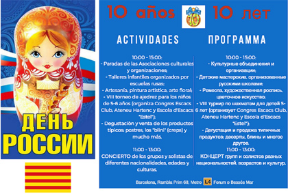 Вот уже десятый год подряд соотечественники празднуют День России на Rambla Prim, 68. Организаторами традиционно выступают ассоциации «Открытый мир» и «Радуга» при поддержке городского совета Барселоны и КСОРС Испании.