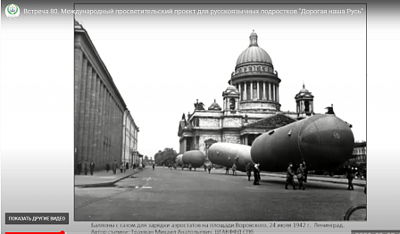 О трагедии жителей осаждённого города детям и подросткам рассказала Оксана Морозан, возглавляющая Центральный государственный архив кинофотофонодокументов Санкт-Петербурга. Слушателями стали юные российские соотечественники из Испании, Марокко, Италии, Франции, Германии, Иордании, Ливана и Люксембурга.