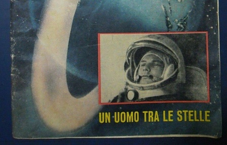 Статья «Человек среди звёзд» на итальянском языке, посвящённая открытию космоса советским космонавтом, рассказывает о научной работе того времени, о подготовке к полёту и значении миссии Гагарина для всего человечества.