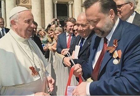 Депутат Госдумы от КПРФ Павел Дорохин поздравил папу Римского Франциска с православной Пасхой, Днем Победы и подарил понтифику георгиевскую ленточку.