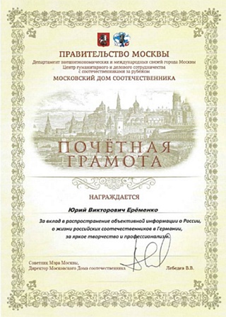 Награда московского правительства присуждена Юрию Еременко «за вклад в распространение объективной информации о России, о жизни российских соотечественников в Германии, за яркое творчество и профессионализм».