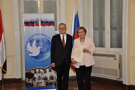 Церемония прошла на прошлой неделе в РЦНК в Каире во время встречи посла с членами Координационного совета общественных организаций российских соотечественников, проживающих в Египте.