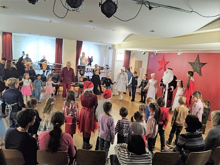 Более 100 человек, русско- и немецкоязычных детей, молодёжи и взрослых, приняли участие в интерактивном театральном представлении в городском Доме культуры. Будь то маленькие или взрослые, все были вовлечены в интерактивную театральную постановку "Бременские городские музыканты". Дед Мороз и его внучка Снегурочка раздавали детям сладости, дети пели песни и читали стихи, сообщает