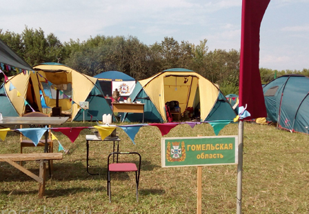 Во время экскурсии по лагерю, превратившемуся в самый настоящий палаточный городок, украшенному флагами стран Союзного Государства, с уютно расставленными палатками и дровами для разведения костра, минские гости узнали о составе участников и непосредственно программе Слета.