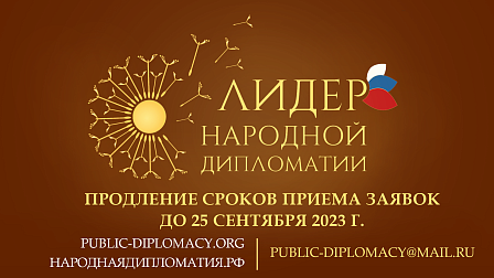 Общероссийская общеcтвенная организация «Ассамблея народов России» объявляет о продлении срока приема заявок на II Международный конкурс «ЛИДЕР НАРОДНОЙ ДИПЛОМАТИИ» - 2023 до 25 сентября включительно.