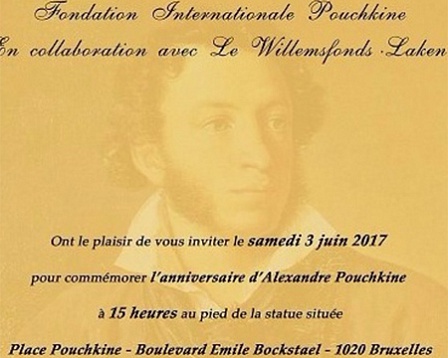 В Брюсселе 3 июня 2017 года возле памятника Александру Сергеевичу Пушкину состоятся праздничные мероприятия, посвященные Дню рождению великого поэта.