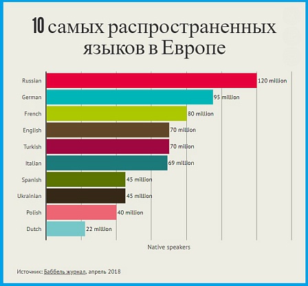 В Европе находится около 50 суверенных государств, здесь живут 740 миллионов жителей, которые говорят более чем на 150 языках. На основе рейтинга babbel.com сайт Общегерманского координационного совета российских соотечественников «Русское поле» рассказывает о первой десятке по числу носителей языка.