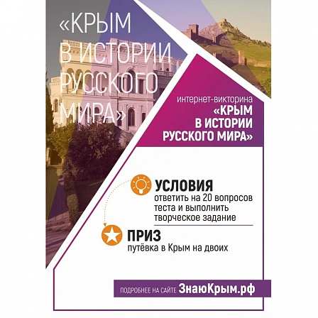 Соотечественники зарубежья могут принять участие в международной интернет-викторине «Крым в истории Русского мира» и выиграть путёвку в Крым на семь дней. Зарегистрироваться и ответить на вопросы онлайн можно до 23 ноября 2020 года.