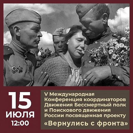 V Международная конференция координаторов движения «Бессмертный полк» и «Поискового движения России», посвященная проекту «Вернулись с фронта» прошла 15 июля на платформе Zoom, передает Polk.press.