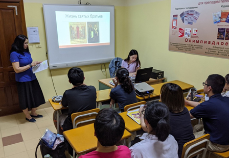 В этот день слушателям курсов была представлена презентация «От славянской письменности до современного русского языка». В ходе уроков ребята узнали о создателях славянского алфавита - святых равноапостольных братьях Кирилле и Мефодии, познакомились с историей возникновения и основных этапах развития славянской письменности, а также об интересных фактах в современном русском языке.