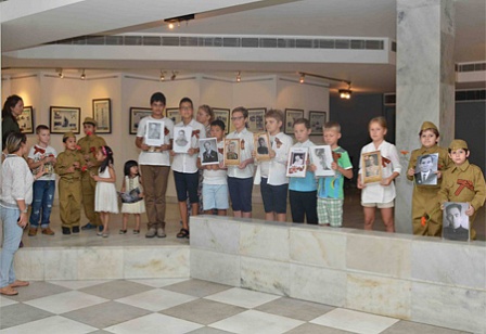 Акция прошла в холле центра: из-за температуры на улице, превышающей плюс 40 градусов по Цельсию, организаторы решили провести ее в кондиционированном помещении. И дети, и многие взрослые пришли с фотографиями близких, участвовавших в Великой Отечественной войне. Мальчики и девочки, одетые в гимнастёрки и пилотки, специально сшитые для этого концерта, исполнили солдатский танец, дружно спели песню «Солнечный круг». Затем рассказали о членах своих семей, которые сражались на фронтах ВОВ.