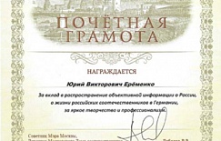 Награда присуждена «за вклад в распространение объективной информации о России, о жизни российских соотечественников в Германии, за яркое творчество и профессионализм».