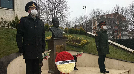 Посол России в Анкаре Алексей Ерхов, сотрудники посольства и гости возложили цветы к памятнику Карлову на территории российской дипмиссии, сообщает