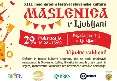 29 февраля 2020 года в 10.00 на центральном рынке Любляны начнутся ставшие традиционными масленичные гуляния. Масштабное праздничное событие ежегодно вызывает интерес к самобытным культурным традициям славянских народов у детей, молодежи, а также взрослых жителей и гостей словенской столицы.
