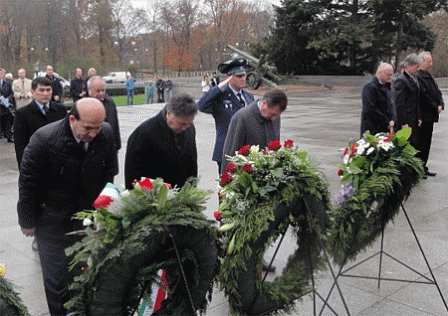 В этой связи состоялось торжественное возложение венков к находящейся на самой высокой точке мемориала колоннаде, на пилонах которой высечены имена погибших в боях за Берлин солдат.