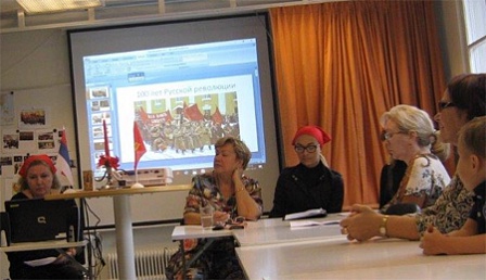 Ольга Шульгина из общества «Привет» сообщила, что соотечественники рассматривали Русскую революцию как единое целое: революционные выступления 1905-1907 годов, Февральская буржуазная, Октябрьская социалистическая и Гражданская война. Целостный анализ событий тех лет с использованием проецируемых фотографий и картин, стихотворений А.Блока, С.Есенина и В.Маяковского позволили эмоционально и доступно представить страницы истории на русском и шведском языках. Эмоциональность усилили костюмы, пением Шаляпина «Эх, дубинушка, ухнем», исполнением хором песни «Белая армия, черный барон» и концерт хора «Матрёшки».