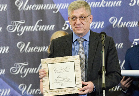 Награду директору МДС Владимиру Лебедеву вручил президент Пушкинского института Виталий Костомаров, в своей речи подчеркнувший важность работы, которую долгие годы проводит Московский Дом соотечественника по сохранению и продвижению русского языка за рубежом.