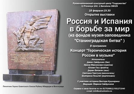 Выставка «Испания и Россия в борьбе за мир», посвященная Дню защитника Отечества, откроется 18 февраля 2016 года в Русско-каталонском культурном центре «Содружество» в Барселоне. Об этом сообщает Координационный совет российских соотечественников в Испании.