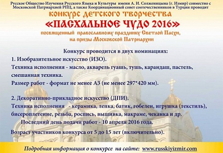 Русское общество изучения русского языка и культуры имени А.И. Солженицына турецкого Измира совместно с Московской Патриархией РПЦ, а также Координационный совет организаций российских соотечественников в Турции при поддержке Россотрудничества проводит конкурс детского творчества «Пасхальное чудо 2016».