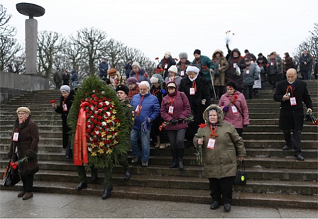 В праздничный день 27 января ветераны и блокадники были построены в колонну возле пропилей Пискарёвского мемориального кладбища для участия в традиционной торжественно-траурной церемонии возложения венков и цветов к монументу «Мать-Родина». Пройдя расстояние от Вечного огня до монумента, они возложили к его подножию цветы и траурный венок с надписью: «От ветеранов Великой Отечественной войны, жителей блокадного Ленинграда, соотечественников, проживающих за рубежом». Надпись означает, что венок возлагается от имени всех блокадников, которые живут по всему миру и не могут лично приехать, в том числе в силу почтенного возраста, и поклониться ленинградской земле.