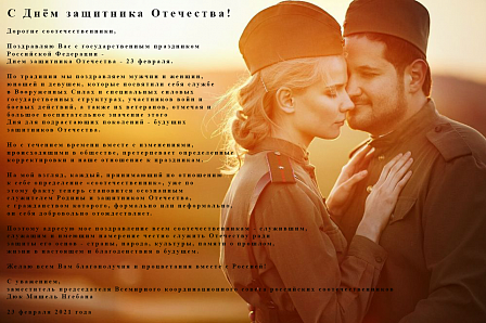 Дорогие соотечественники! Поздравляю Вас с государственным праздником Российской Федерации – Днем защитника Отечества – 23 февраля. По традиции мы поздравляем мужчин и женщин, юношей и девушек, которые посвятили себя службе в Вооруженных Силах и специальных силовых государственных структурах, участников войн и боевых действий, а также их ветеранов, отмечая и большое воспитательное значение этого Дня для подрастающих поколений – будущих защитников Отечества.