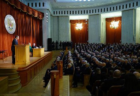 В адрес нашего собрания поступила целая серия поздравлений и приветственных посланий. С вашего разрешения хотел бы огласить поздравительное послание Президента Российской Федерации В.В.Путина.